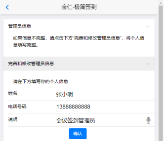 如果管理员没有录入过自己的个人信息,则点击“完善和修改管理员信息”,将管理员的信息填写完整。只有三个需要填写的内容: