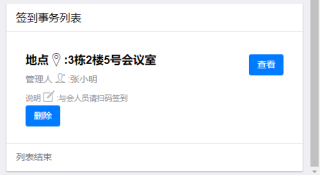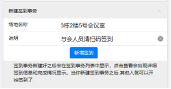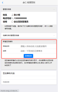 在新建签到事务的方格中,有场地和说明需要填写,填写完成后,签到事务就建立好了。可以建立多个不同的签到事务,如果信息有误,删除事务列表中的事务,重新填写一个即可。