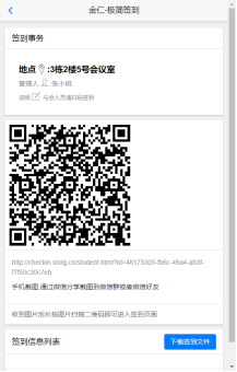 签到人签到之后,在签到信息列表 中会显示所有签到人的名单,并且可以下载电子表格文件,用于后期统计。