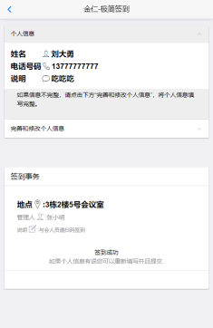 新建完成之后,在签到事务列表中会显示签到任务。点击查看可以看到签到事务的发布信息和签到情况。